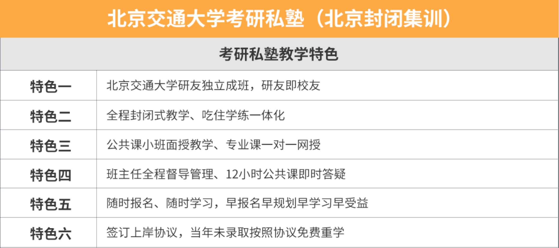 新祥旭考研机构开设有北京交通大学考研私塾课程,北京交通大学考研私塾为北交大考研学子提供专属的封闭式集训学习环境,考研私塾全程封闭式教学、吃住学练一体化;公共课小班面授教学(PS:若公共课某科特别弱亦可单独再另咨一对一针对性补习)、专业课一对一面授或网授;班主任全程督导管理、公共课专业课即时免费答疑。考研学员随报随学,专业务实,真诚周到,助力上岸!