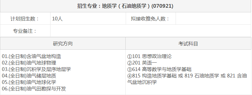 本专业考试科目为:101思想政治理论、201英语一、614高等数学与地质学基础、815构造地质学基础或819石油地质学或821含油气盆地沉积学