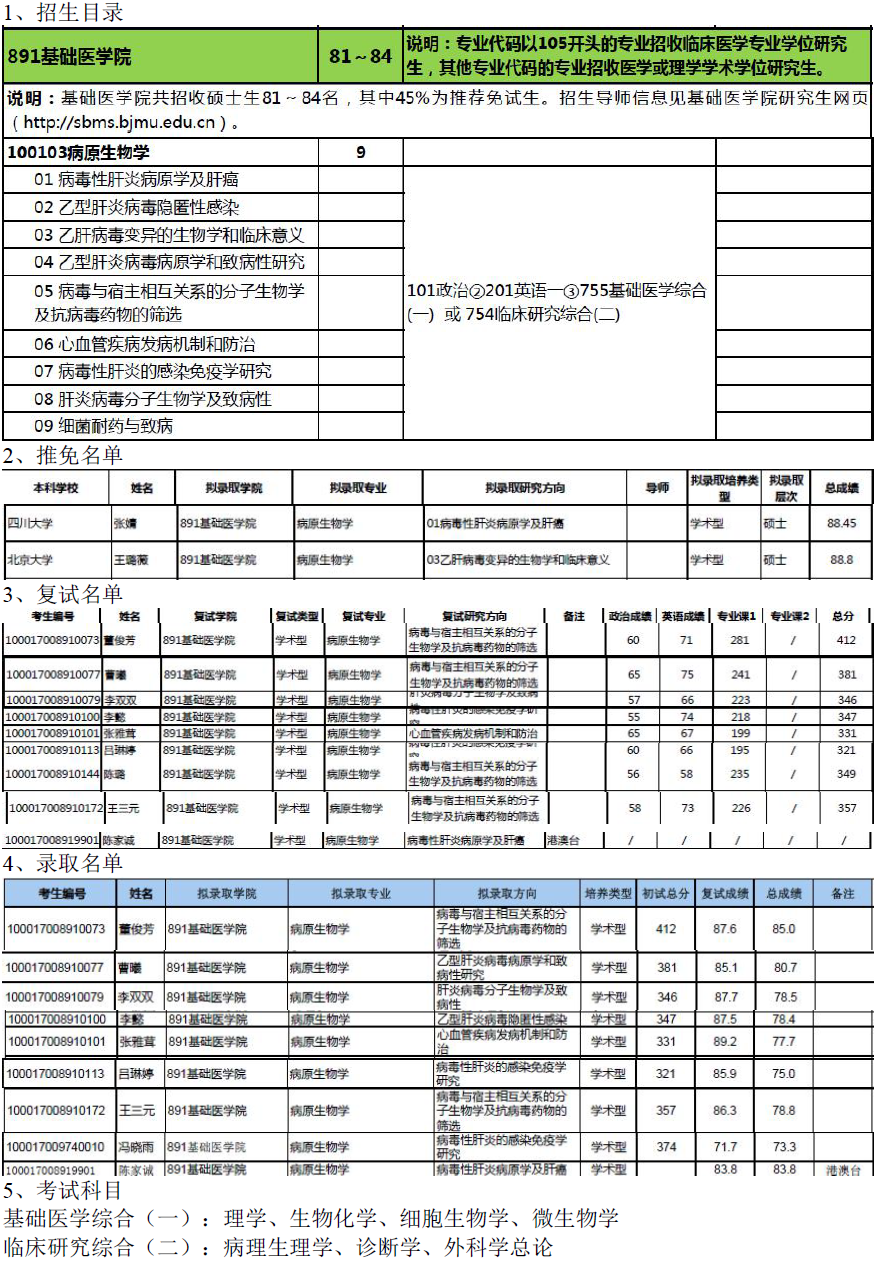 北京大学医学部100103病原生物学考研目录
