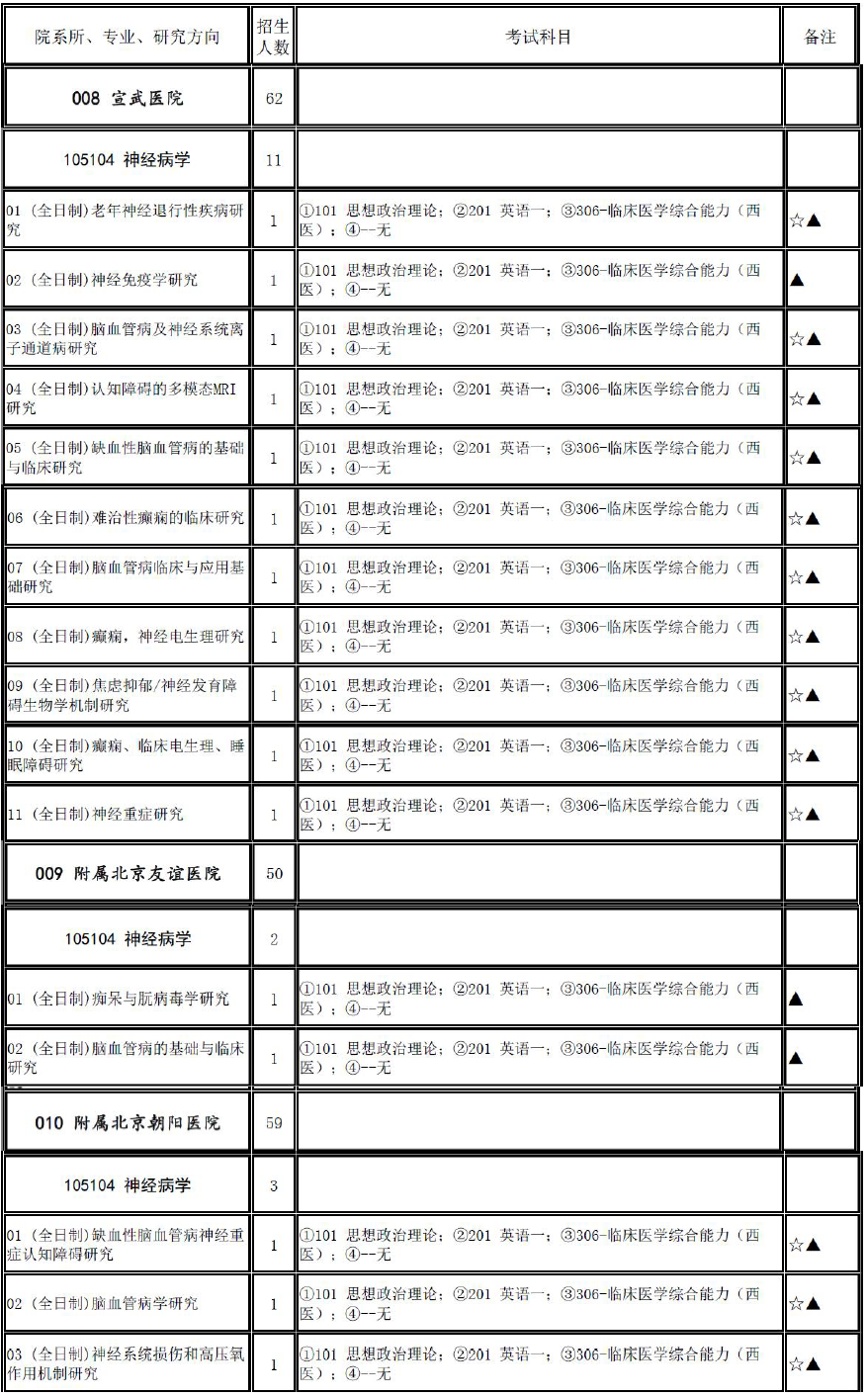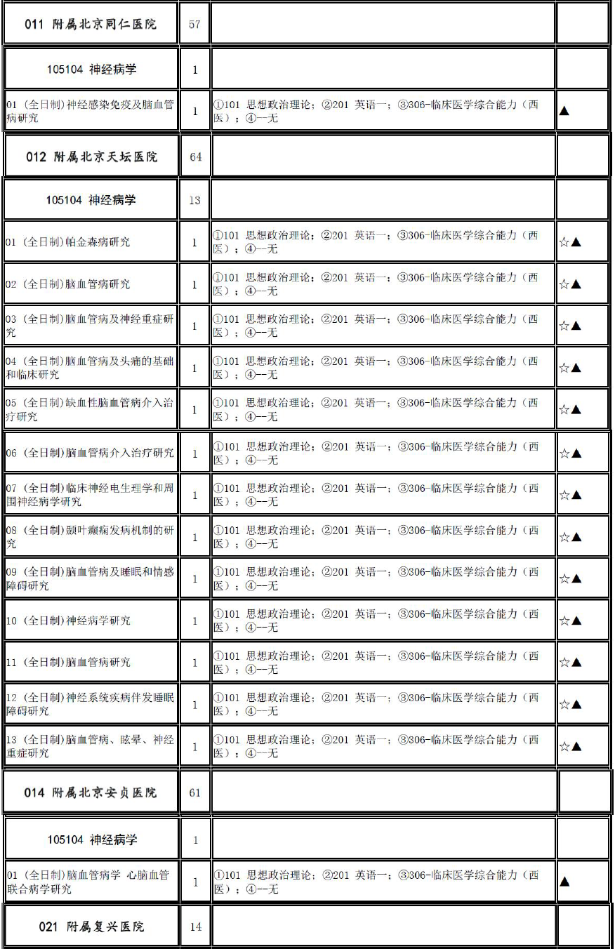 2017年首都医科大学105104神经病学招生目录、推免名单