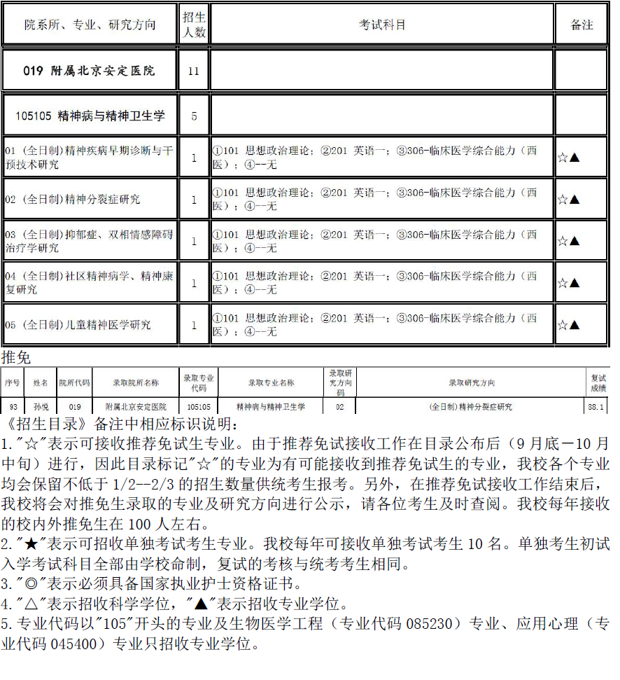 2017年首都医科大学105105精神病与精神卫生学招生目录、推免名单