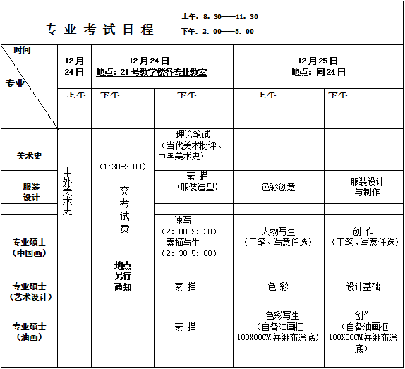 2017年12月24日上午,美术理论。2017年12月24下午、25日,专业考试。
