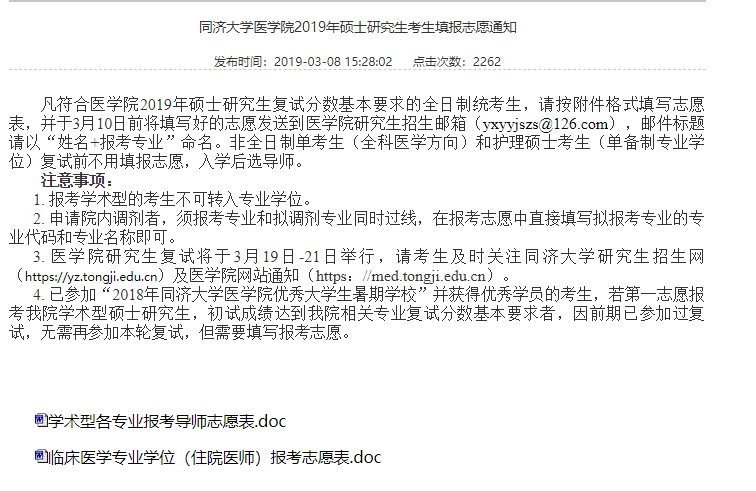 凡符合医学院2019年硕士研究生复试分数基本要求的全日制统考生,请按附件格式填写志愿表,并于3月10日前将填写好的志愿发送到医学院研究生招生邮箱(yxyyjszs@126.com),邮件标题请以“姓名+报考专业”命名。非全日制单考生(全科医学方向)和护理硕士考生(单备制专业学位)复试前不用填报志愿,入学后选导师。