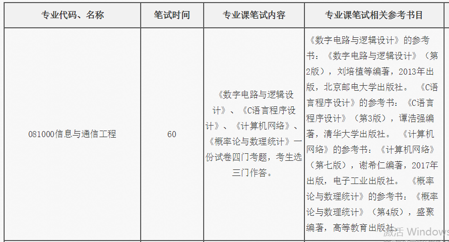 可见面试是决定性的,所以面试一定要尽力给老师留下一个好印象。下面先说面试的准备,再说笔试。面试中很多组一般是先进行一段英语自我介绍或几句英语问答或朗读并翻译一段文献,然后3-5个老师问问题,问的题目一般有专业课,如通信原理、计算机网络等,也可能问一下数学等基础课,这个每个组是不太一样的,到时候可以向师兄师姐打听一下。笔试内容是学院统一的,考试科目见下图: