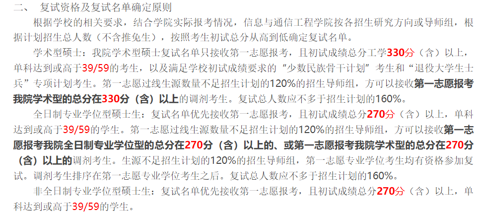 复试分数线和复试录取情况都可以参考上述网站。去年的复试线为:学硕330、专硕270,单科线39/59:即英语和政治分数线为39分,数学和专业课分数线为59分。下图为学校的通知。