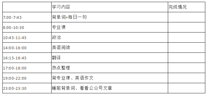 英语单词和每日一句我是每天都有坚持的,表格里就没有写,翻译的部分,根据自己哪 个时间段的复习时间比较充裕自己安排;我是属于那种前期进入状态比较慢的时间,但是找 到感觉之后后期效率比较高的,所以我前期准备的时间都比较长,大家可以适当的压缩前面 3-6 月时间。毕竟我的时间安排也只是给大家一个参考,你们还是主要按照自己的复习节奏 来!(每个人习惯不一样,时间安排大家参考一下就好,不要照搬哦!)
