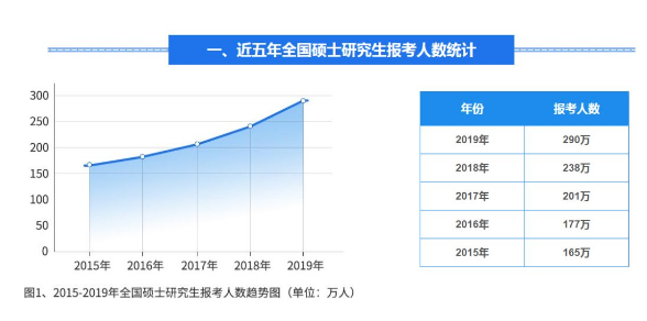 2018年12月23日,又一年的考研大战开始,这一年的考研人数,再一次变成了“历史新高”。从教育部公布的数据来看,2019年全国考研报名人数达到了史无前例的290万人,比2018年考研人数增加了52万人,增幅达到了21.8%,考研增加人数和增长率均为近年来最高。从上图中我们可以看出,近5年,考研人数逐年增长,同2015年的165万人相比增加了125万人,研究生报考人数的快速上涨也引发了社会的广泛关注。
