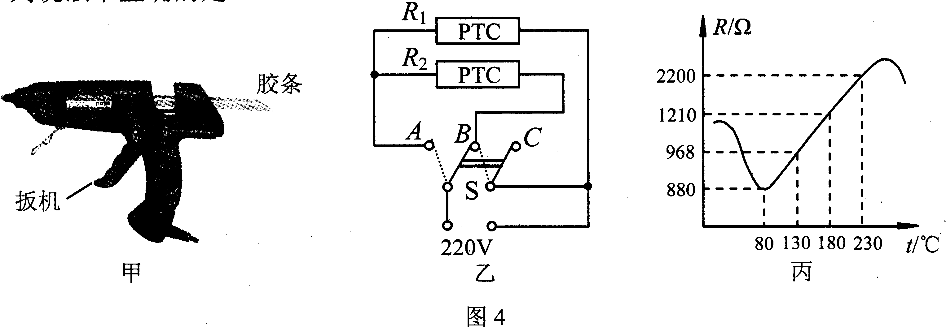 A.用筷子轻轻敲击瓶口,甲瓶的音调最高 B.用嘴贴着瓶口吹气,甲瓶的音调最高 C.用筷子轻轻敲击瓶口,丁瓶的音调最低 D.用嘴贴着瓶口吹气,丁瓶的音调最高 10.如图甲所示的热熔胶枪是一种装修工具,用于材料涂胶。它的内部有2只相同的PTC(正温度系数)加热元件,其工作电路如图乙所示,扣动扳机能使固体胶条向前挤压,联动开关S同时掷向A、B,枪口冒出胶液,松开扳机,联动开关S同时掷向B、C。单只PTC元件的电阻随温度的变化如图丙所示。关于PTC元件的工作情况,下列说法中正确的是 A.扣动扳机,两只PTC元件串联在电路中 B.松开扳机,只有一只PTC元件接入电路 C.松开扳机,当温度为80℃时,电路消耗的电功率为55W D.扣动扳机,当温度为180℃时,1min电路消耗的电能为4800J