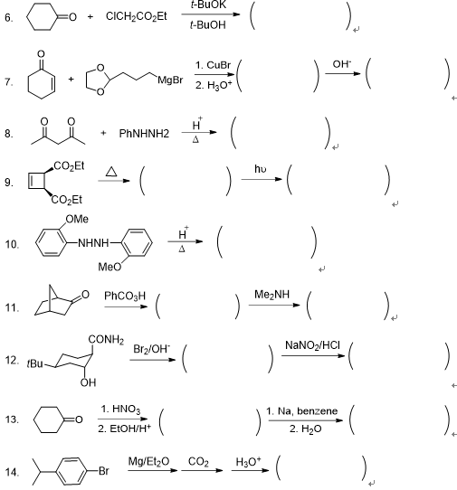 12. 苯甲醛为无色液体,长期暴露在空气中会慢慢变为白色结晶,发生的反应是 ( ) A. 自由基氧化反应 B. 离子型加成反应 C. 氧化还原反应 D. 协同反应 13. 1 g下列化合物加到10 ml水中, 分层并浮在上面的有 ( ) A. 吡啶和甘油 B. 己烷和乙醚 C. 乙醇和乙酸 D. 氯仿和丁醛 14. Claisen酯缩合经常用来制备 ( ) A. b-羟基酯 B. d-羟基酯 C. b-酮基酯 D. d-酮基酯 15. 下列化合物沸点最低的是 ( ) A. 正丁烷 B. 2-氯丁烷 C. 正丁酮 D. 乙醚 16. 含有硫原子的氨基酸是 ( ) A. 蛋氨酸 B. 甘氨酸 C. 半胱氨酸 D. 丝氨酸 17. 芳香族伯胺的重氮化反应是在 ( ) 溶液中进行 A. 弱酸性 B. 碱性 C. 中性 D. 强酸性 18. 可以进行Cannizarro反应的化合物是 ( ) A. 甲醛 B. 丙醛 C. 糠醛 D. 2,2-二甲基丁醛 19. 烷烃进行卤代反应的中间体是 ( ) A. 碳正离子 B. 自由基 C. 碳负离子 D. 碳烯 20. 甲烷分子的空间构型以及碳原子的杂化类型是 ( ) A. 四方椎体,sp3杂化 B. 三角椎体,sp2杂化 C. 正四面体,sp2杂化 D. 正四面体,sp3杂化 二、完成如下反应,写出主要产物(14小题,每空3分,共60分)