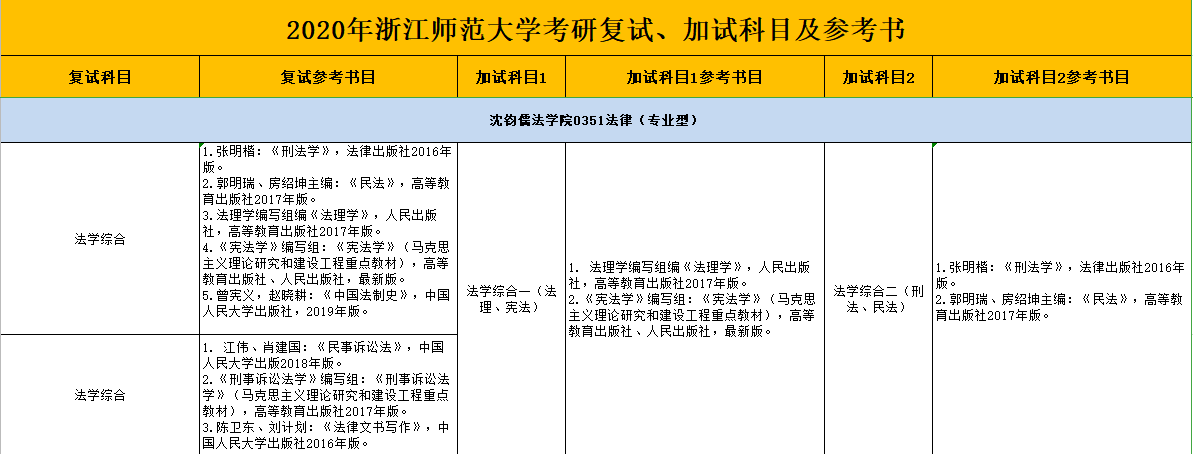 浙师大考研辅导班:2020年浙江师范大学复试参考书目-沈钧儒法学院0351法律(专业型)