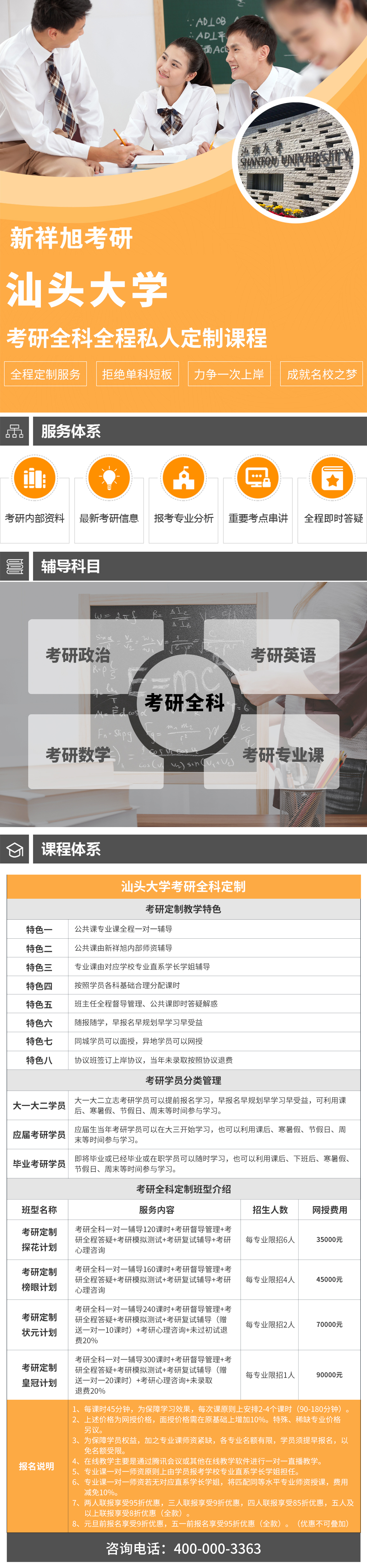 课程描述:新祥旭考研专注汕头大学考研全科定制辅导,以效果为导向,以上岸为目标,为广大考研学生提供个性化、定制化、多对一的考研全科全程辅导,考研公共课和考研专业课皆为一对一辅导,全国各地考研学生可以面授也可以网授,力争让考研学生顺利考取汕头大学攻读硕士研究生。